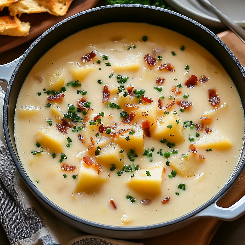 Ladle your silky smooth potato soup into bowls and top generously with crispy bacon bits and chopped chives. Enjoy immediately while it’s still warm!
