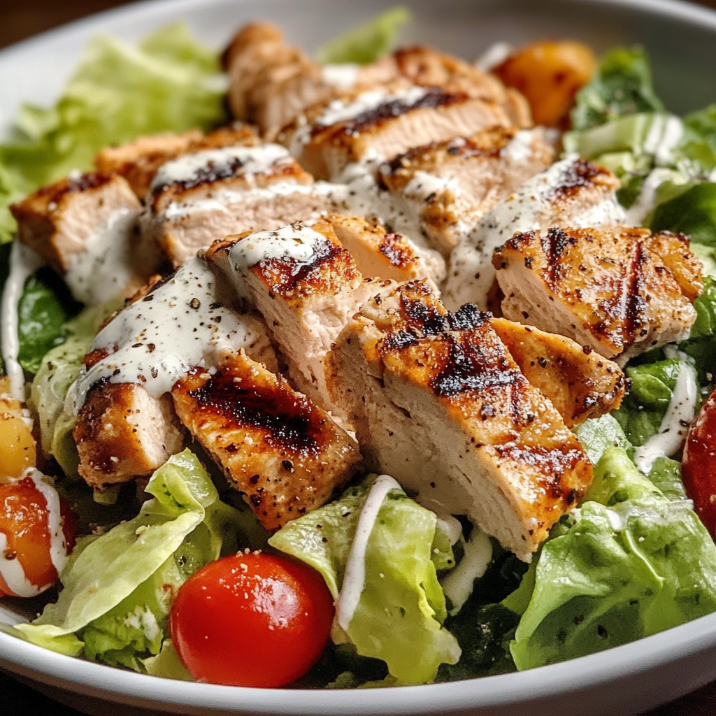 Once grilled chicken has cooled slightly, slice it into strips. In a large bowl, combine chopped romaine lettuce, grilled chicken slices, croutons, and drizzle generously with Caesar dressing.