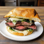 Chimichurri Steak Sandwich is a flavor-packed culinary delight that elevates your ordinary sandwich experience. With juicy flank steak marinated in a vibrant chimichurri sauce made from fresh herbs, garlic, and zesty red wine vinegar, each bite is a burst of mouthwatering goodness. Perfect for barbecues or casual gatherings, this dish effortlessly brings people together and transforms any meal into a fiesta. Serve it on crusty bread, and you’ll have an unforgettable dining experience that will leave your guests craving more.