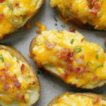 Start by baking your potatoes until they’re tender. While they cool, cook the bacon until crispy. Scoop out the insides of the potatoes and mix with cooked bacon, cheese, and diced apples. Refill the skins and bake again until golden.