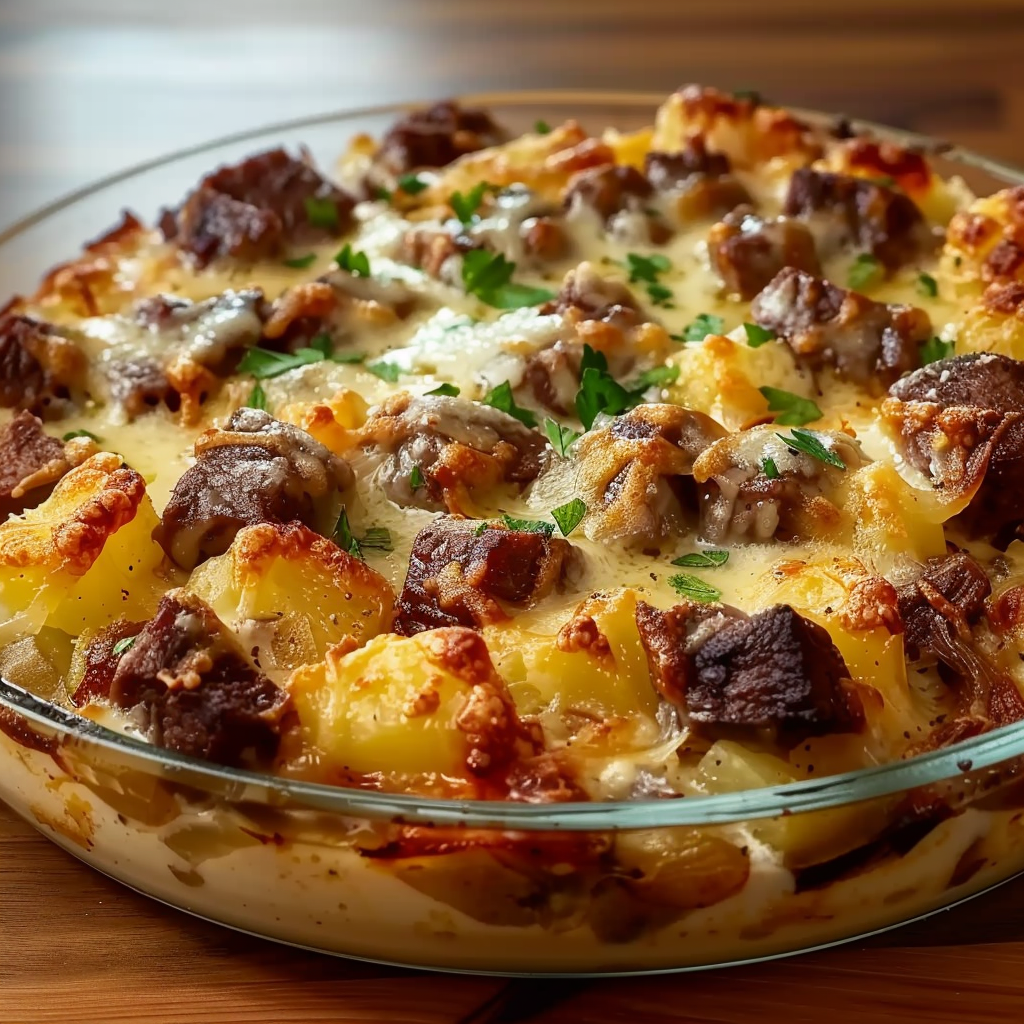 Cowboy Steak and Potato Casserole is a hearty, soul-warming dish that brings together tender steak, creamy Yukon Gold potatoes, and a luscious cheesy topping. Ideal for family gatherings or cozy nights at home, this casserole is not only simple to make but also guarantees to satisfy even the pickiest eaters. With its rich flavors and comforting texture, every bite will have you coming back for more—perfect for sharing with loved ones!