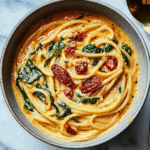 Creamy Sun-Dried Tomato Spaghetti with Spinach is a rich and flavorful pasta dish that combines the vibrant taste of sun-dried tomatoes with fresh spinach and a creamy sauce. This recipe is easy to prepare and perfect for weeknight dinners. The spaghetti absorbs the flavors of the sauce, creating a delicious meal that suits both vegetarians and meat lovers alike.