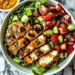 In a large bowl (or on individual plates if you’re feeling fancy), combine mixed greens, sliced cucumber, cherry tomatoes, and those beautifully sliced chicken pieces.