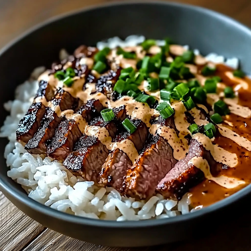 - Assemble bowls with jasmine rice, sliced steak, spicy cream sauce, and garnish with green onions.