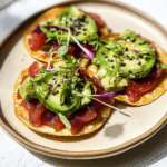 Tuna Tostadas with Avocado, Ginger, and Scallion are a vibrant, mouthwatering dish that combines the freshness of sushi-grade tuna with creamy avocado and zesty ginger, all atop crispy tostada shells. Perfect for gatherings or a quick weeknight meal, these tostadas deliver an explosion of flavors and textures in every bite. Easy to prepare and visually stunning, they are sure to impress both family and friends at any occasion.