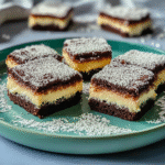 - Drizzle the melted chocolate over the cooled coconut base, then let it set before cutting into squares.
