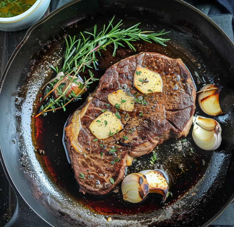 Add Aromatics: After about 4-5 minutes (or until a nice crust forms), add crushed garlic cloves, rosemary, and thyme around the steak. This will infuse amazing aromas into your dish.